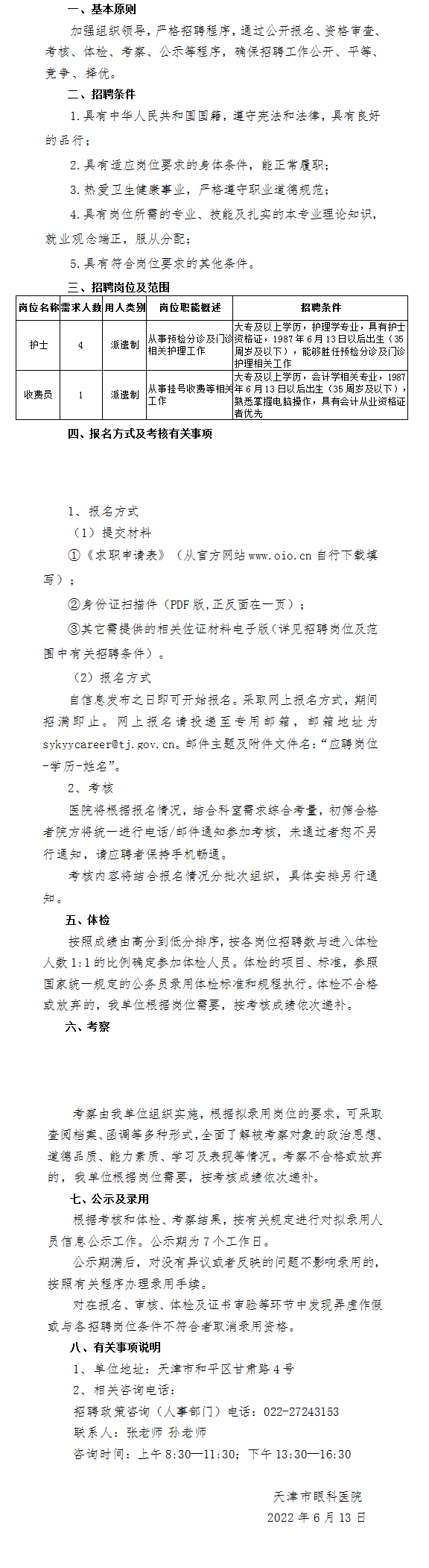 天津市眼科醫(yī)院2022年招聘第三批派遣制工作人員5人
