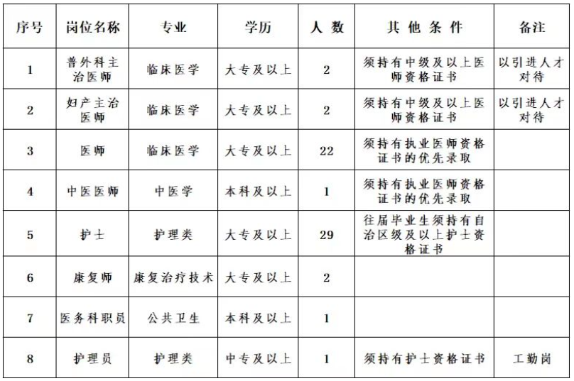 面向全國誠招應(yīng)屆或歷屆畢業(yè)生。醫(yī)護人員對持有執(zhí)業(yè)醫(yī)師、護師資格證人員優(yōu)先錄取。此次需招聘臨床醫(yī)生27名(其中中醫(yī)學(xué)1名)、護士29名、康復(fù)師2名、醫(yī)務(wù)科職員1名、護理員1名。
