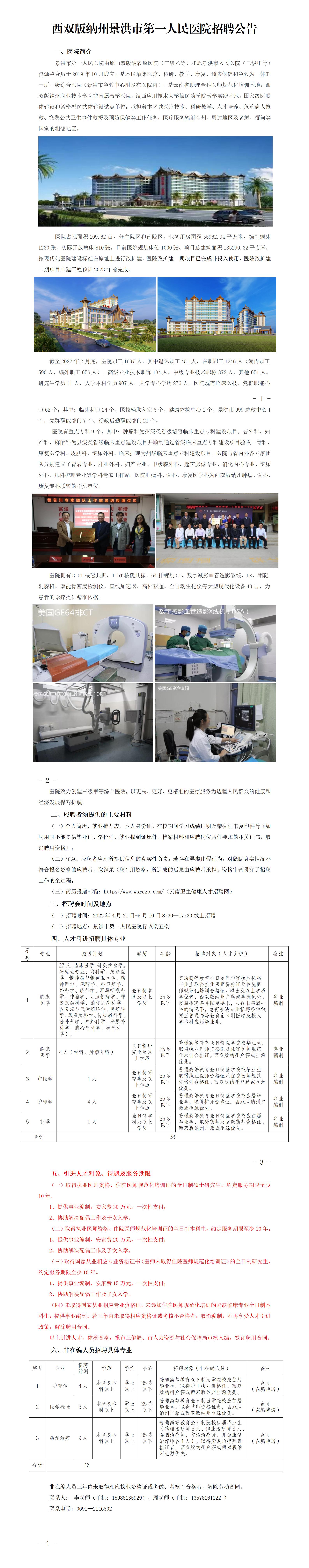 西雙版納州景洪市第一人民醫(yī)院2022年招聘工作人員38名
