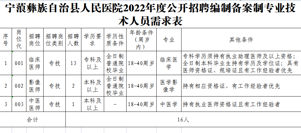 招聘崗位、名額及條件詳見《寧蒗彝族自治縣人民醫(yī)院2022年度公開招聘編制備案制專業(yè)技術(shù)人員需求表》。