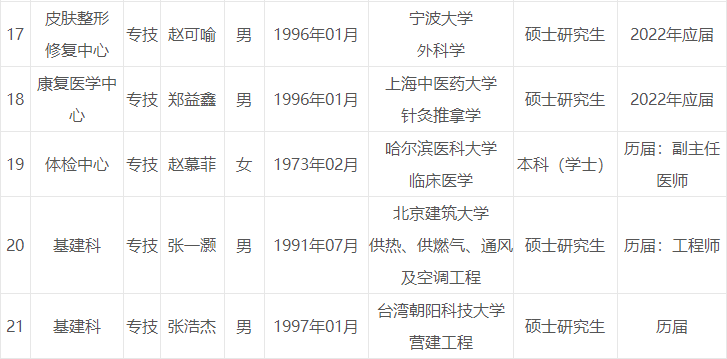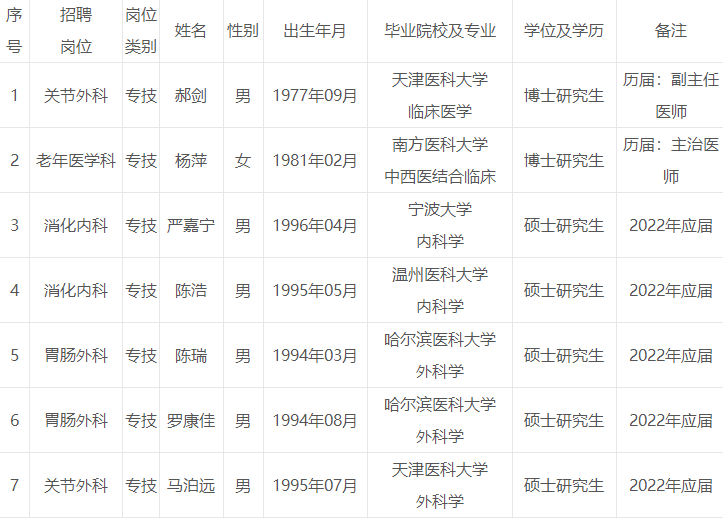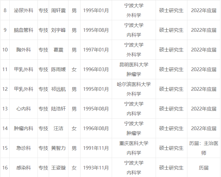 根據(jù)《寧波市事業(yè)單位公開招聘工作人員實施辦法》和《寧波大學醫(yī)學院附屬醫(yī)院高層次人才公開招聘公告》(2021年12月1日),寧波大學醫(yī)學院附屬醫(yī)院公開招聘工作通過公開報名、統(tǒng)一考試,已進入擇優(yōu)聘用程序。根據(jù)面試、考核、體檢結果,在合格人員中,經寧波大學醫(yī)學院附屬醫(yī)院領導班子集體研究,確定以下21位擬聘用人員,現(xiàn)公示如下:![]()