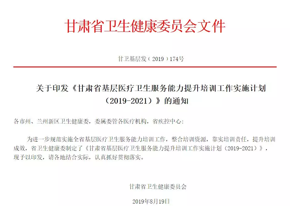 8月19日,甘肅省衛(wèi)健委發(fā)布關(guān)于印發(fā)《甘肅省基層醫(yī)療衛(wèi)生服務(wù)能力提升培訓(xùn)工作實(shí)施計(jì)劃(2019-2021)》的通知。