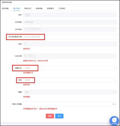 (2)基本信息會(huì)根據(jù)考生注冊(cè)時(shí)填寫的信息自動(dòng)判斷引用,性別、出生日期如未引用,考生可手動(dòng)選擇,民族和健康狀態(tài)請(qǐng)根據(jù)實(shí)際情況下拉選擇。