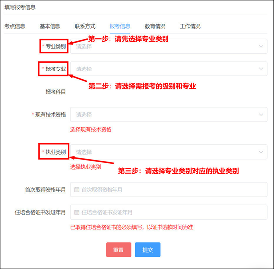 考生須根據(jù)所選的專業(yè)類別,勾選對(duì)應(yīng)的執(zhí)業(yè)類別,執(zhí)業(yè)類別不為“無(wú)”時(shí),首次注冊(cè)年月不能為空。