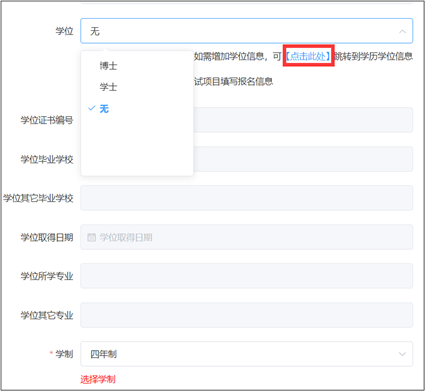 如無(wú)學(xué)位,請(qǐng)?jiān)凇皩W(xué)位”中選擇“無(wú)”。