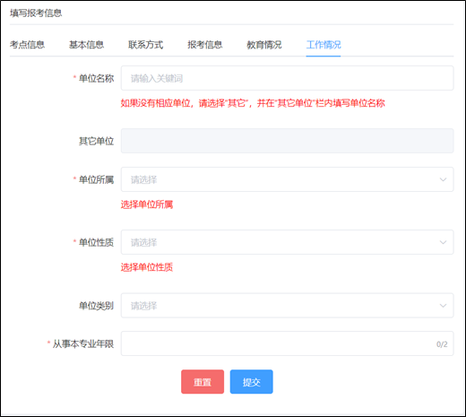 (6)如實(shí)填寫工作情況,包括“單位名稱”、“單位所屬”、“單位性質(zhì)”、“單位類別”和“從事本專業(yè)年限”;單位名稱為“其它”時(shí),單位類別不能為空。