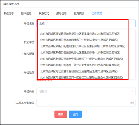 “單位名稱”需要輸入關(guān)鍵字(不可輸入單位縮寫、簡(jiǎn)稱)檢索后,在列表中選擇相應(yīng)單位,不可自行填寫。