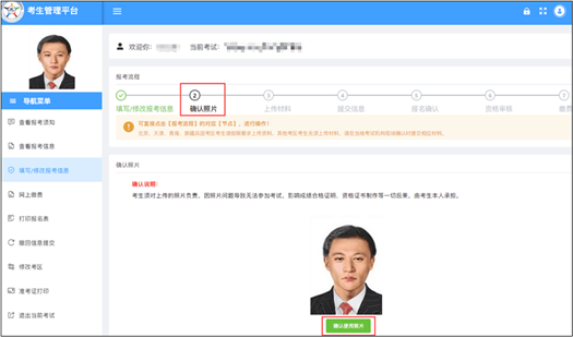 (7)以上信息提交后,系統(tǒng)會(huì)自動(dòng)跳轉(zhuǎn)至確認(rèn)照片頁(yè)面,也可點(diǎn)擊【報(bào)考流程】中的“確認(rèn)照片”節(jié)點(diǎn)。