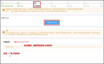 (8)確認(rèn)照片后,采用線上確認(rèn)的考區(qū),系統(tǒng)將跳轉(zhuǎn)至【上傳材料】頁(yè),也可點(diǎn)擊【報(bào)考流程】中的“上傳材料”節(jié)點(diǎn),進(jìn)入上傳材料頁(yè)面,請(qǐng)考生按照考區(qū)的要求上傳相關(guān)證明材料,材料上傳完成后,點(diǎn)擊“提交報(bào)名信息”。