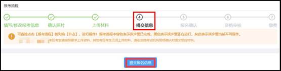 未采用線上確認(rèn)的考區(qū),系統(tǒng)將跳轉(zhuǎn)至【提交報(bào)名信息】頁(yè),考生也可點(diǎn)擊【報(bào)考流程】中的“提交信息”節(jié)點(diǎn),確認(rèn)無(wú)誤后點(diǎn)擊“提交報(bào)名信息”。