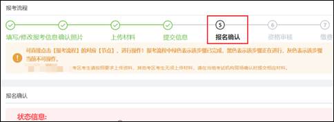 經(jīng)報(bào)名點(diǎn)或考點(diǎn)確認(rèn)后,【報(bào)名確認(rèn)】節(jié)點(diǎn)變?yōu)榫G色,同時(shí)【資格審核】節(jié)點(diǎn)變?yōu)楹谏?