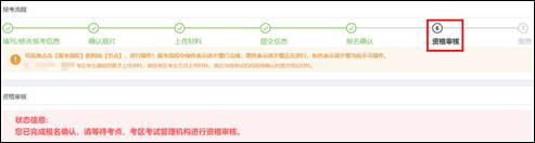 3.采用線上確認(rèn)方式的考區(qū),考生在報(bào)名系統(tǒng)中提交報(bào)名信息后,等待系統(tǒng)反饋報(bào)名確認(rèn)結(jié)果。如提示“確認(rèn)不通過(guò)”,考生須在所在考區(qū)規(guī)定的截止日期前重新上傳報(bào)名材料,逾期未重新上傳并提交報(bào)名信息的,視為自動(dòng)放棄本次考試。