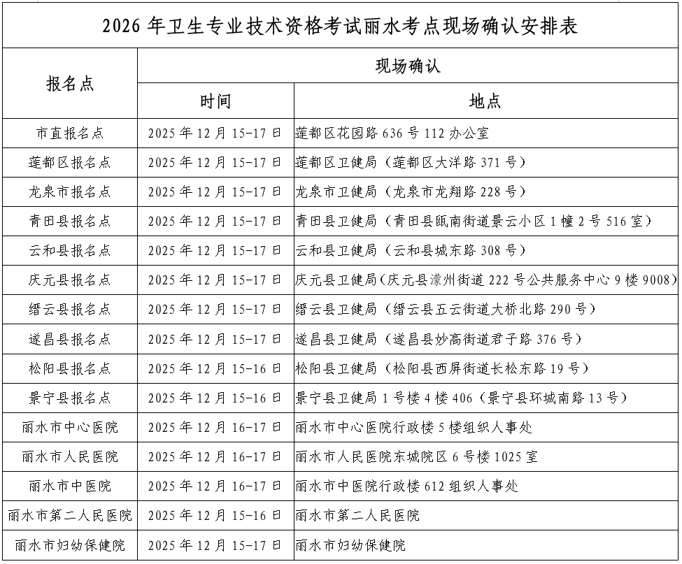 2.現(xiàn)場確認(rèn)。在2025年12月15日-12月17日期間,考生須持《2026年度衛(wèi)生專業(yè)技術(shù)資格考試報名申請表》及相關(guān)的證件、材料原件及復(fù)印件,到相應(yīng)報名點進(jìn)行現(xiàn)場確認(rèn)(具體確認(rèn)時間及各報名點地址見下表)。