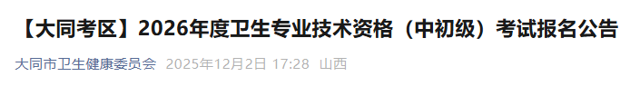 【大同考區(qū)】2026年度衛(wèi)生專業(yè)技術(shù)資格(中初級)考試報名公告