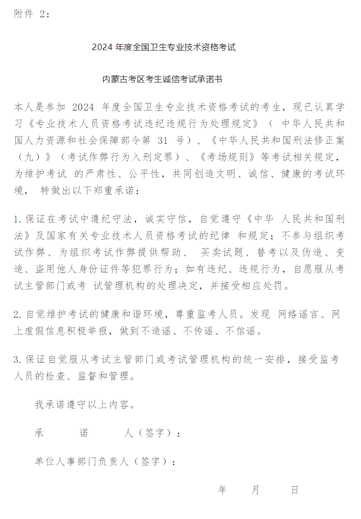2.2024 年度全國衛(wèi)生專業(yè)技術(shù)資格考試內(nèi)蒙古考區(qū)考生誠信考試承諾書
