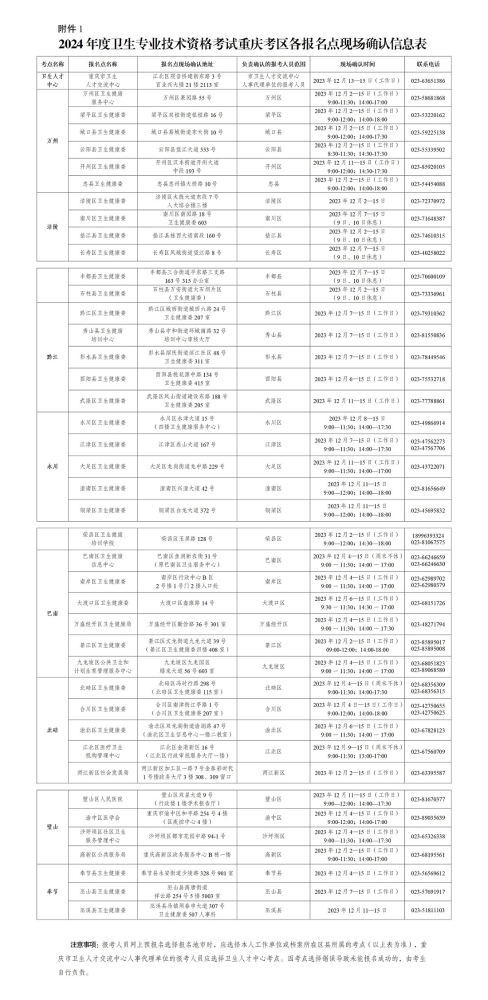 各報(bào)名點(diǎn)現(xiàn)場確認(rèn)地址和時(shí)間可參看《2024年度衛(wèi)生專業(yè)技術(shù)資格考試重慶考區(qū)各報(bào)名點(diǎn)現(xiàn)場確認(rèn)信息表》(附件1)。