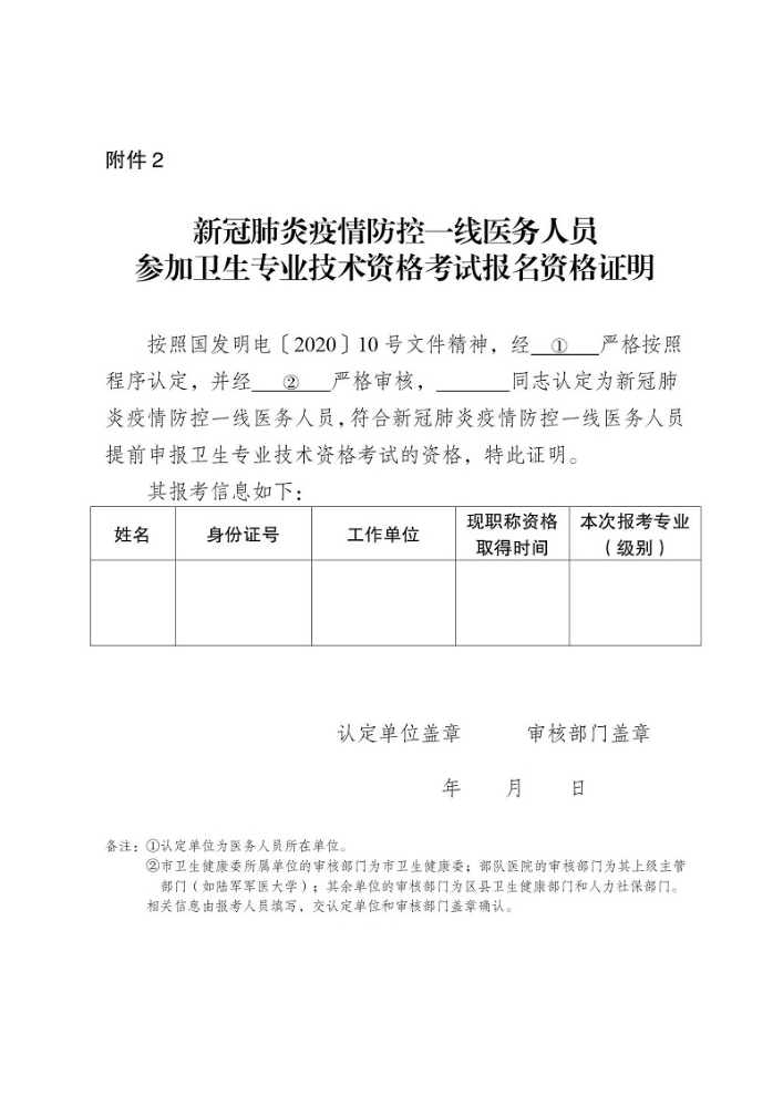 ①符合“按照《國務(wù)院應(yīng)對(duì)新型冠狀病毒感染肺炎疫情聯(lián)防聯(lián)控機(jī)制關(guān)于聚焦一線貫徹落實(shí)保護(hù)關(guān)心愛護(hù)醫(yī)務(wù)人員措施的通知》(國發(fā)明電〔2020〕10號(hào))規(guī)定,認(rèn)定為參加新冠肺炎疫情防控的一線醫(yī)務(wù)人員,在符合相應(yīng)報(bào)名條件的基礎(chǔ)上,晉升高一級(jí)職稱可以提前一年申報(bào)參加衛(wèi)生專業(yè)技術(shù)資格考試”的,還需提交《新冠肺炎疫情防控一線醫(yī)務(wù)人員參加衛(wèi)生專業(yè)技術(shù)資格考試報(bào)名資格證明》(附件2),并經(jīng)相關(guān)部門蓋章確認(rèn)的原件,原則上只享受一次政策優(yōu)惠。
