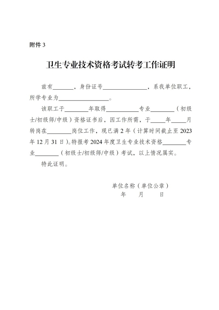 ④符合“因工作崗位變動(dòng),需報(bào)考現(xiàn)崗位工作專業(yè)類別”的,還需提交《衛(wèi)生專業(yè)技術(shù)資格考試轉(zhuǎn)考工作證明》(附件3),并經(jīng)相關(guān)部門蓋章確認(rèn)的原件。