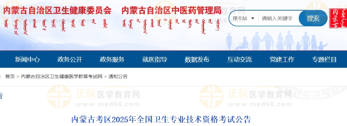 內(nèi)蒙古自治區(qū)衛(wèi)生健康委員會(huì)發(fā)布內(nèi)蒙古考區(qū)2025年全國衛(wèi)生專業(yè)技術(shù)資格考試公告,醫(yī)學(xué)教育網(wǎng)整理具體內(nèi)容如下: