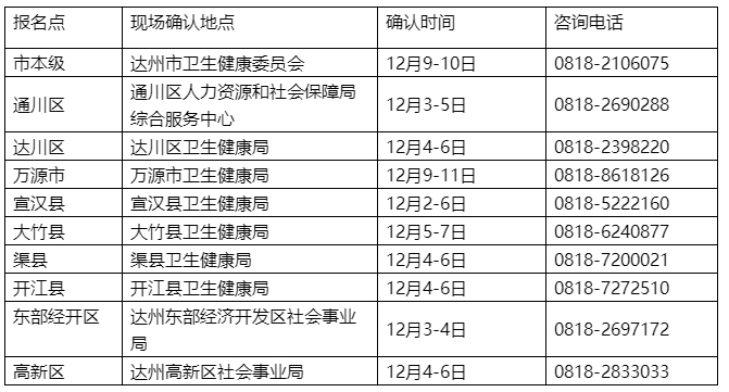 各縣(市、區(qū))轄區(qū)內(nèi)醫(yī)療衛(wèi)生機構(gòu)(含民營醫(yī)療機構(gòu)、個體診所)的報考人員,請到轄區(qū)內(nèi)所在地的縣(市、區(qū))衛(wèi)生健康局進行現(xiàn)場審核確認。市級醫(yī)療衛(wèi)生單位及市級相關(guān)部門的報考人員請到達州市衛(wèi)生健康委員會進行現(xiàn)場審核確認。