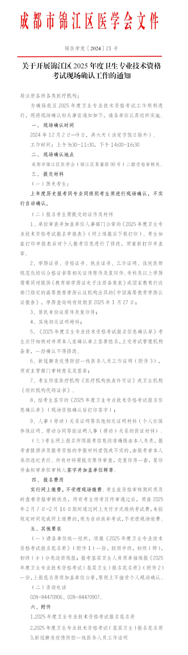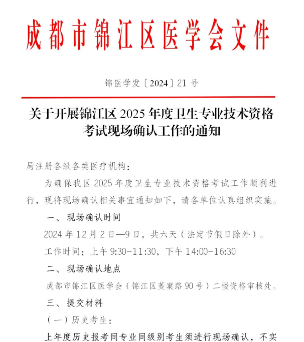 成都錦江區(qū)2025年衛(wèi)生專業(yè)技術(shù)資格考試現(xiàn)場確認(rèn)工作的通知
