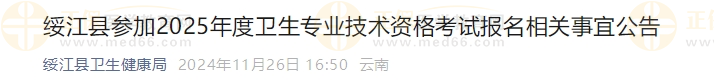 云南綏江縣參加2025年度衛(wèi)生專業(yè)技術(shù)資格考試報名相關(guān)事宜公告公布啦!醫(yī)學(xué)教育網(wǎng)整理具體內(nèi)容如下: