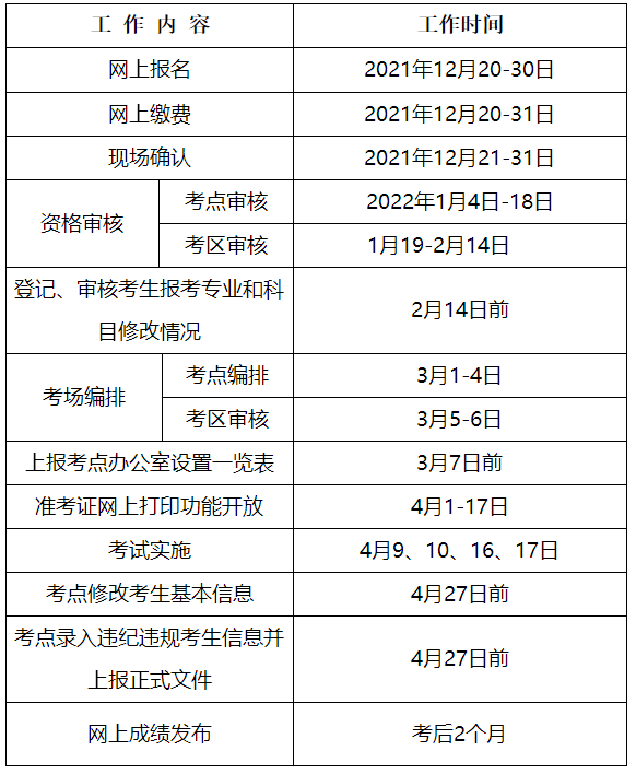 考生經(jīng)過網(wǎng)上預(yù)報名、網(wǎng)上繳費、單位審核、現(xiàn)場確認(rèn)、資格審核等程序,報考資格經(jīng)考區(qū)審核通過后,方為報名成功,各階段安排如下:
