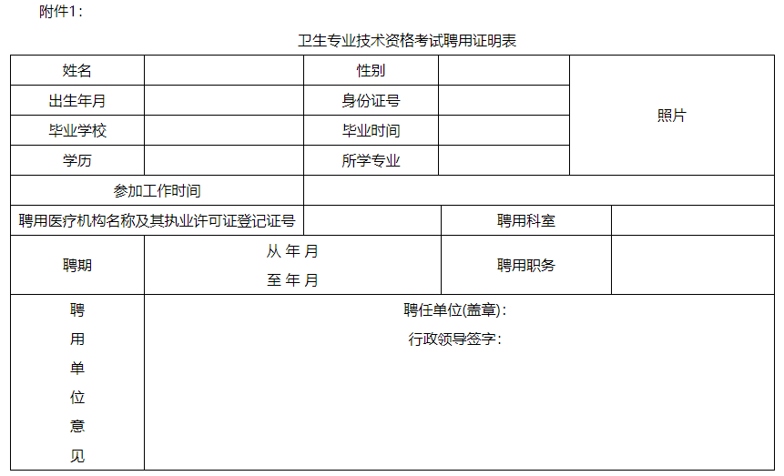 2、工作單位出具的衛(wèi)生專業(yè)技術(shù)資格考試聘用證明表(附件1)。