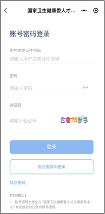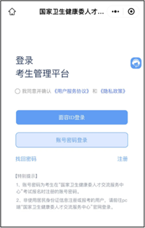 打開百度、微信、支付寶客戶端,搜索“國家衛(wèi)生健康委人才交流服務中心”小程序,進入考生管理平臺登錄界面。