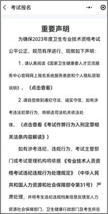 歷史考生報名參加2023年度考試的,首先需完成考生管理平臺注冊和基本信息填報,具體流程和操作方法請點擊查看《考生管理平臺考生注冊須知》。完成后,考生可通過國家衛(wèi)生健康委人才交流服務中心官方網(wǎng)站或小程序(百度、微信、支付寶)進行考試報名。