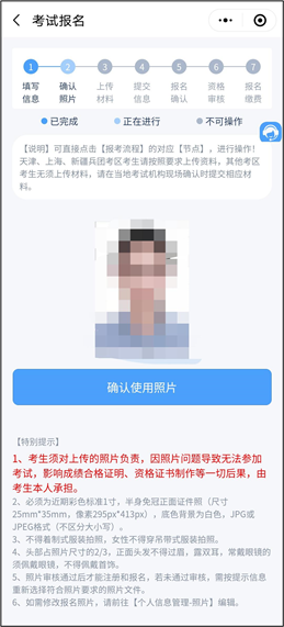 以上信息提交后,系統(tǒng)會自動跳轉(zhuǎn)至【確認照片】頁面,也可點擊報考流程上的【確認照片】節(jié)點。