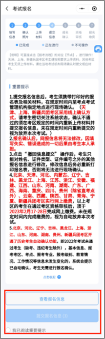 確認照片后系統(tǒng)將跳轉(zhuǎn)至【提交報名信息】頁,也可點擊【報考流程】處的“提交信息”節(jié)點,確認無誤后點擊“提交報名信息”。