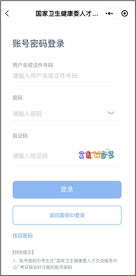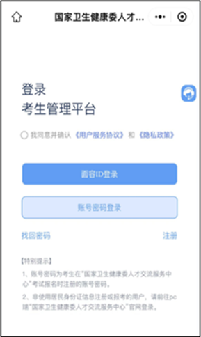 打開百度、微信、支付寶客戶端,搜索“國家衛(wèi)生健康委人才交流服務中心”小程序,進入考生管理平臺登錄界面。