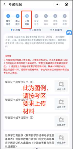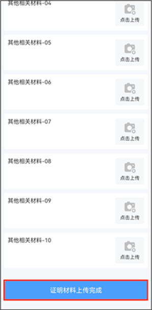 6.采用線上確認的考區(qū),系統將跳轉至【上傳材料】頁,也可點擊報考流程中的【上傳材料】節(jié)點,進入上傳材料頁面,請考生按照考區(qū)的要求上傳相關證明材料,材料上傳完成后,點擊“證明材料上傳完成”,考生可再次查看報名信息,確認無誤后,點擊“提交報名信息”。