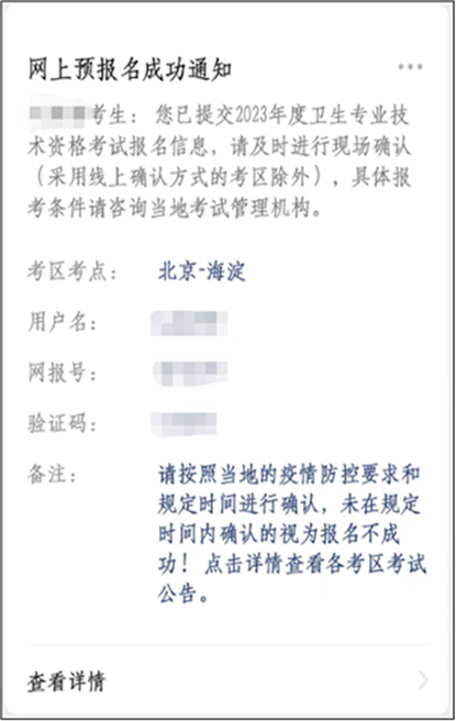 考生提交報名信息后,將收到中國衛(wèi)生人才網微信公眾號發(fā)送的微信提醒(見下圖),請考生按照考區(qū)相關要求及時進行報名確認。逾期未進行確認的,視為自動放棄考試。