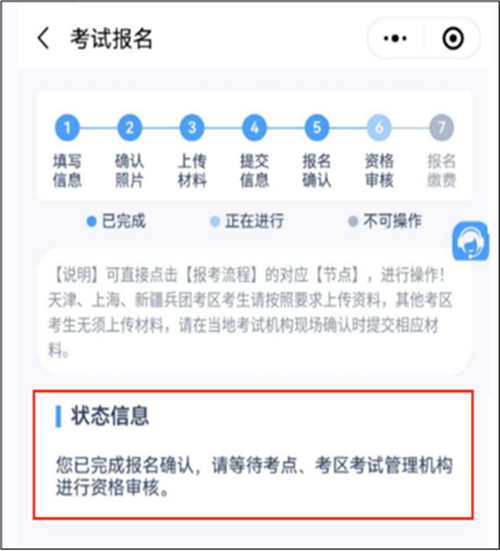 提交報名信息后,考生須在當地考試管理機構規(guī)定時間內,按照規(guī)定的方式進行報名確認。采用現場確認方式的考區(qū),考生須攜帶報名表和相關材料前往指定地點進行報名確認;采用線上確認方式的考區(qū),考生在報名系統中提交報名信息后,等待系統反饋報名確認結果,如提示“確認不通過”,考生須在所在考區(qū)規(guī)定的截止日期前重新上傳報名材料,逾期未重新上傳并提交報名信息的,視為自動放棄本次考試。