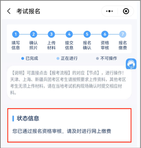 未開通網上繳費的考區(qū),【資格審核】節(jié)點變?yōu)樯钏{色即表示報名成功。