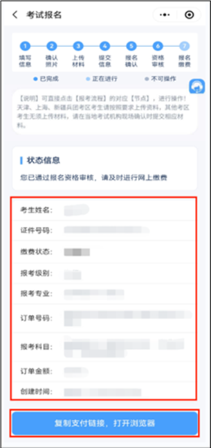 點擊報考流程上的【報名繳費】節(jié)點,核對報考專業(yè)科目和金額,確認無誤后按系統提示進行繳費。