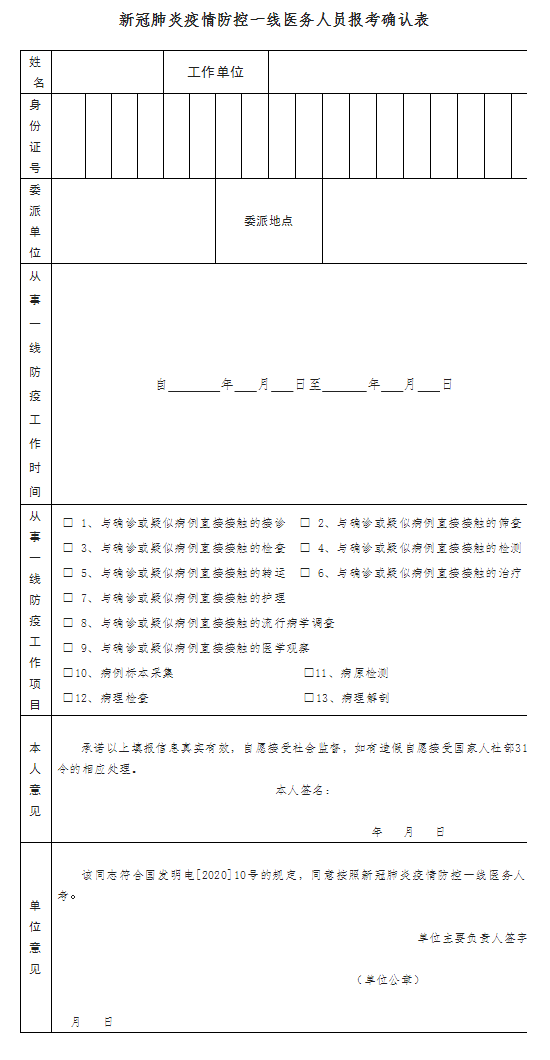 3、《新冠肺炎疫情防控一線醫(yī)務(wù)人員報(bào)考確認(rèn)表》