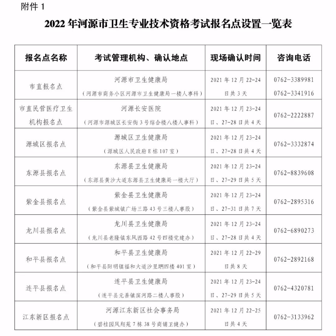 4.各縣區(qū)報名點現(xiàn)場確認的時間和地點詳見附件1《2022年河源市衛(wèi)生專業(yè)技術資格考試報名點設置一覽表》。