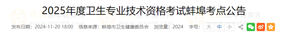2025年度衛(wèi)生專業(yè)技術資格考試蚌埠考點公告公布啦!醫(yī)學教育網整理具體內容如下: