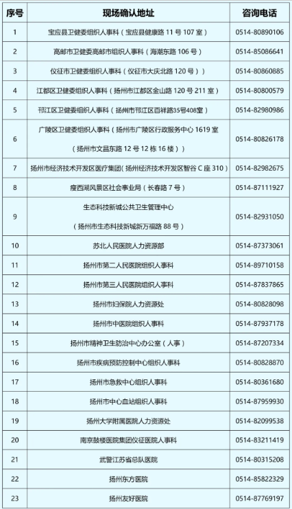 市直單位、駐揚單位的考生在考生所在單位人事部門進行現(xiàn)場確認,其他單位的考生在單位所在轄區(qū)報名點進行現(xiàn)場確認。