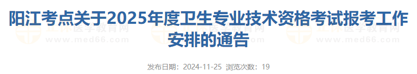 2025年度衛(wèi)生專業(yè)技術(shù)資格考試廣東陽(yáng)江考點(diǎn)公告通知啦!醫(yī)學(xué)教育網(wǎng)整理具體內(nèi)容如下: