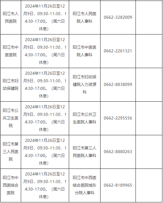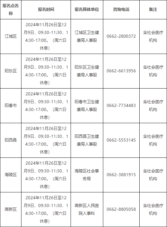 (3)市直衛(wèi)生單位(含社會(huì)辦醫(yī)療單位)沒(méi)有設(shè)置報(bào)名點(diǎn)的統(tǒng)一到陽(yáng)江考點(diǎn)進(jìn)行報(bào)名確認(rèn)(陽(yáng)江考點(diǎn)設(shè)在陽(yáng)江市衛(wèi)生健康局五樓人事科,地點(diǎn):陽(yáng)江市江城區(qū)新江北路1179號(hào),單位電話:0662-3180099),確認(rèn)時(shí)間2024年11月27日-12月11日(周六、日休息)。