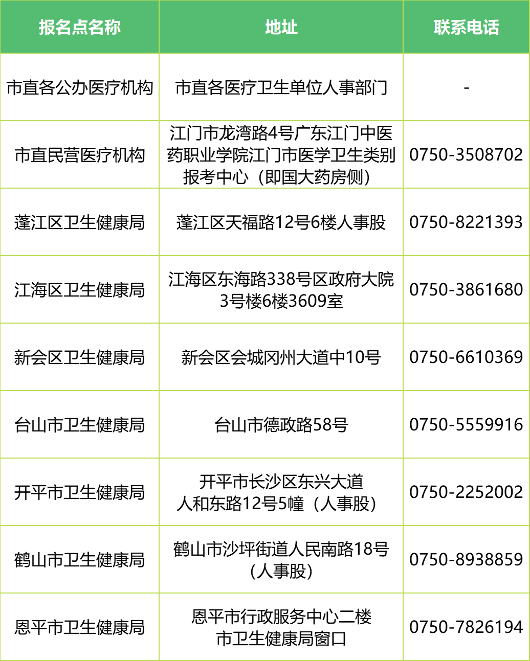 江門市衛(wèi)生健康局市直各公辦醫(yī)療機(jī)構(gòu)均單獨(dú)設(shè)立報(bào)名點(diǎn),受理本單位報(bào)考人員的報(bào)名確認(rèn)(考生須關(guān)注單位人事部門的報(bào)名通知),報(bào)考人員攜帶報(bào)名材料的原件及復(fù)印件(詳見附件2),并于單位人事部門規(guī)定的時(shí)間內(nèi)辦理報(bào)名確認(rèn)手續(xù)。