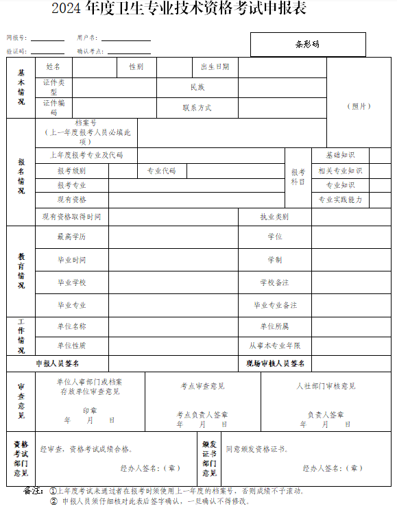 2、2024年度衛(wèi)生專業(yè)技術(shù)資格考試報(bào)名申報(bào)表(此為樣表,以網(wǎng)報(bào)時(shí)下載打印為準(zhǔn))