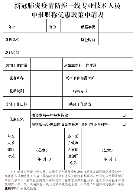 (四)根據(jù)《中央應(yīng)對(duì)疫情工作領(lǐng)導(dǎo)小組關(guān)于全面落實(shí)進(jìn)一步保護(hù)關(guān)心愛(ài)護(hù)醫(yī)務(wù)人員若干措施的通知》(國(guó)發(fā)明電〔2020〕5號(hào))和《人力資源社會(huì)保障部辦公廳關(guān)于做好新冠肺炎疫情防控一線專業(yè)技術(shù)人員職稱工作的通知》(人社廳發(fā)〔2020〕23號(hào))的相關(guān)要求,參加新冠肺炎疫情防控一線的醫(yī)務(wù)人員,在符合相應(yīng)報(bào)名條件的基礎(chǔ)上,晉升高一級(jí)職稱可以提前一年申報(bào)參加衛(wèi)生專業(yè)技術(shù)資格考試;對(duì)做出突出貢獻(xiàn),獲得省部級(jí)以上表彰獎(jiǎng)勵(lì)的,晉升高一級(jí)職稱可以直接申報(bào)參加考試。參加新冠肺炎疫情防控的一線醫(yī)務(wù)人員范圍按照《國(guó)務(wù)院應(yīng)對(duì)新型冠狀病毒感染肺炎疫情聯(lián)防聯(lián)控機(jī)制關(guān)于聚焦一線貫徹落實(shí)保護(hù)關(guān)心愛(ài)護(hù)醫(yī)務(wù)人員措施的通知》(國(guó)發(fā)明電〔2020〕10號(hào))的有關(guān)規(guī)定執(zhí)行(新冠肺炎疫情防控一線醫(yī)務(wù)人員以經(jīng)國(guó)家衛(wèi)生健康委核準(zhǔn)的《湖南省新冠肺炎疫情防控一線醫(yī)務(wù)人員和防疫工作者工作情況統(tǒng)計(jì)表》為準(zhǔn),截止至2022年12月6日)。上述享受提前申報(bào)的人員,原則上只享受一次政策優(yōu)惠。新冠肺炎疫情防控的一線醫(yī)務(wù)人員考生填報(bào)《新冠肺炎疫情防控一線專業(yè)技術(shù)人員申報(bào)職稱優(yōu)惠政策申請(qǐng)表》(附件4)。