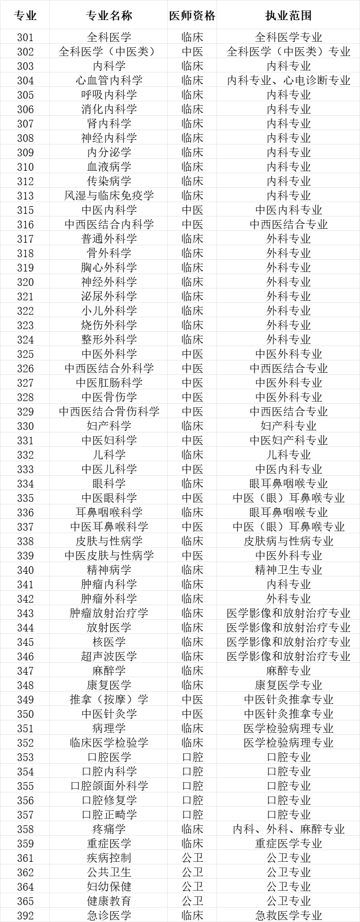 (八)根據(jù)《執(zhí)業(yè)醫(yī)師法》及有關(guān)文件規(guī)定,凡報(bào)考專業(yè)代碼為301-365以及392專業(yè)的人員,應(yīng)嚴(yán)格按照衛(wèi)生技術(shù)人員的準(zhǔn)入要求、所從事專業(yè)工作、醫(yī)師資格類別和注冊(cè)范圍,選擇相應(yīng)專業(yè)進(jìn)行申報(bào),禁止跨執(zhí)業(yè)類別報(bào)考,并在報(bào)名時(shí)提交相應(yīng)專業(yè)醫(yī)師資格證書和執(zhí)業(yè)證書。各申報(bào)專業(yè)對(duì)應(yīng)的醫(yī)師資格類別和注冊(cè)范圍見(jiàn)《申報(bào)專業(yè)與醫(yī)師資格類別執(zhí)業(yè)范圍對(duì)應(yīng)表》(附件5)。