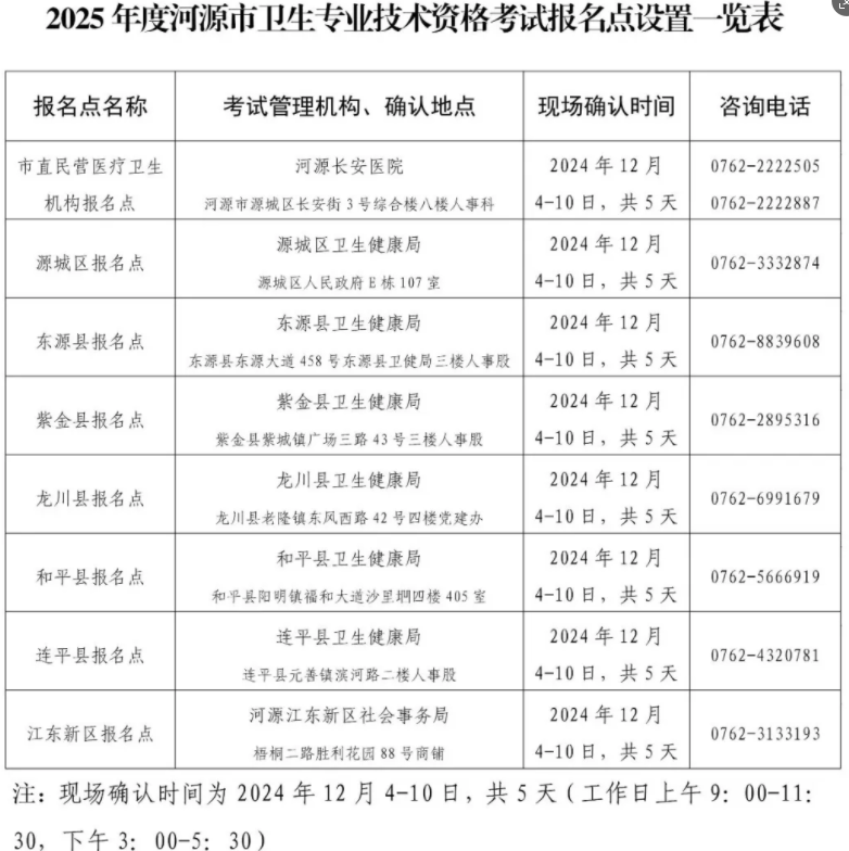 4.各縣區(qū)報名點現(xiàn)場確認(rèn)的時間和地點詳見《2025年河源市衛(wèi)生專業(yè)技術(shù)資格考試報名點設(shè)置一覽表》。