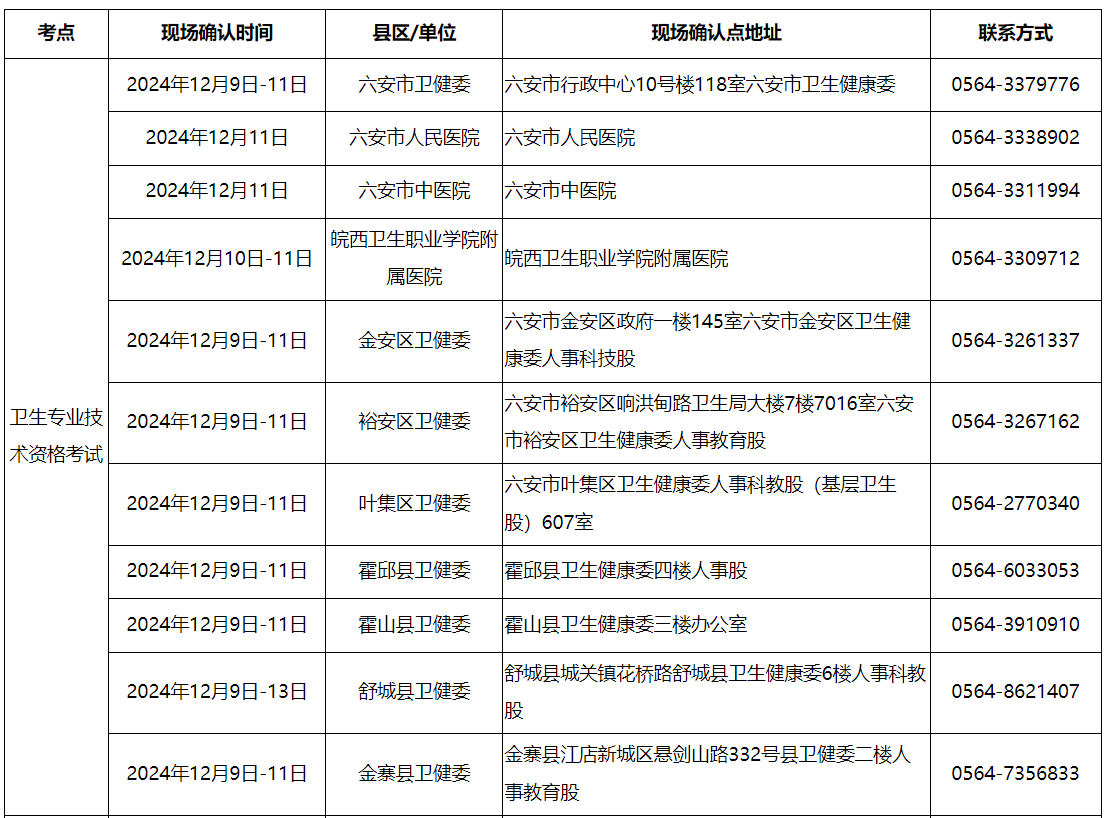 安徽六安2025年衛(wèi)生專業(yè)技術(shù)資格考試現(xiàn)場(chǎng)確認(rèn)點(diǎn)一覽表